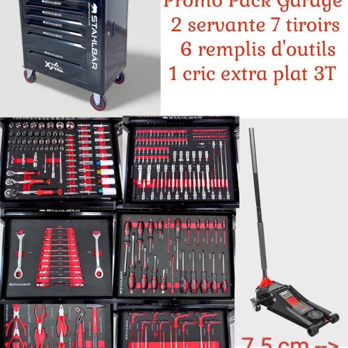 Pack Garage 2 Servantes Stahlbar 7 tiroirs 6 remplis + 1 cric extra plat Dstoolpro 3 Tonnes