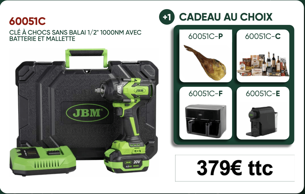 Clé à chocs sans balai 1/2” 1000nm avec mallette JBM 60051C + cadeau au choix