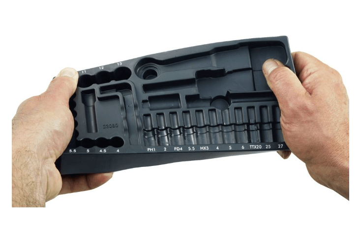 Insert : support interne en polypropylène injecté, résistant à la torsion, aux huiles et aux acides, facilitant l’organisation des pièces.