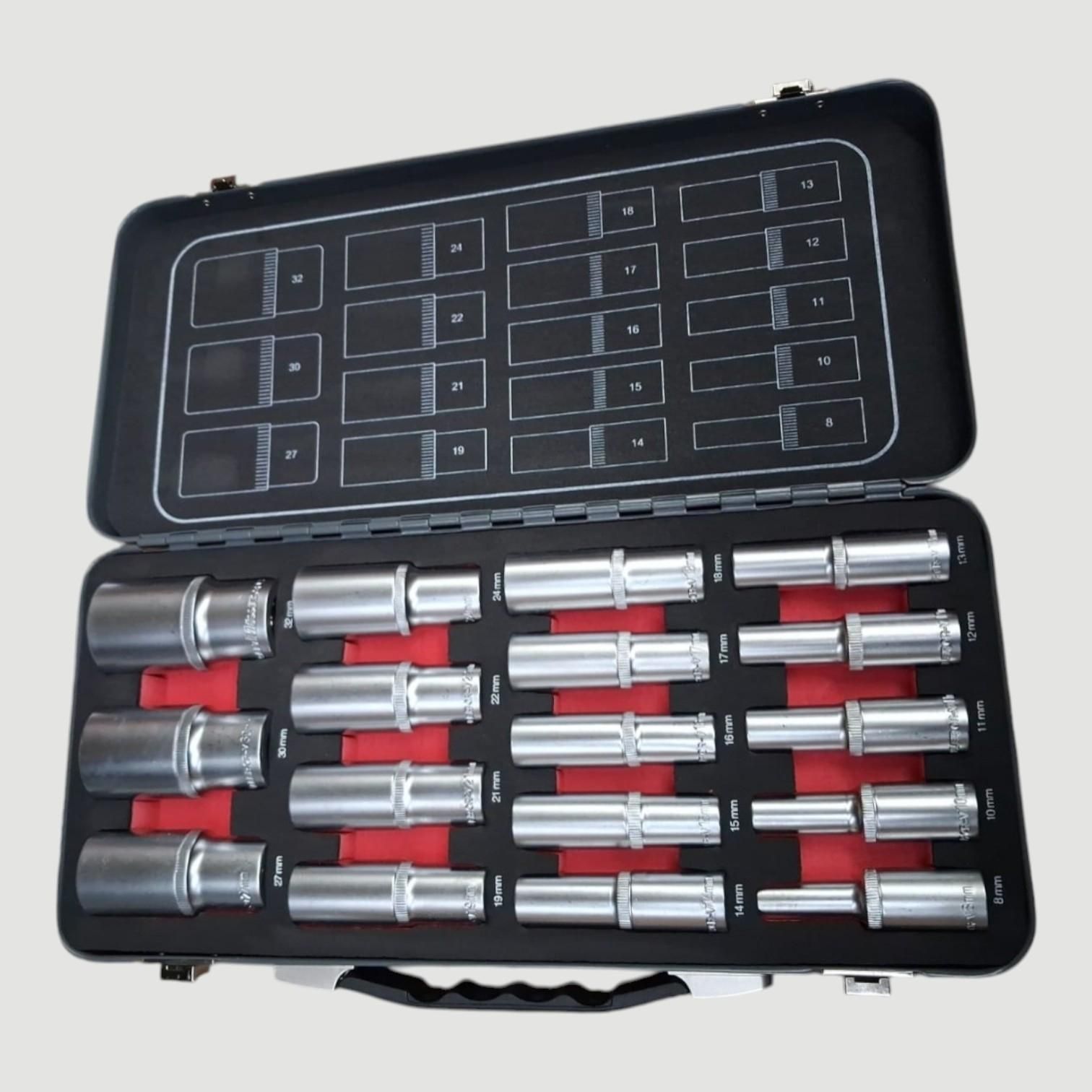 Jeu de 17 douilles longues 1/2 6 pans pour cliquet. Coffret metalique avec rangement des douilles dans des compartiments numéroté par taille