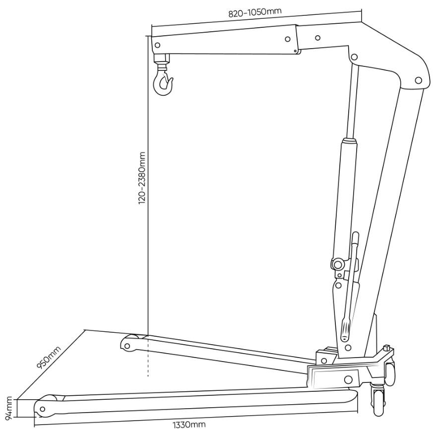 La grue fonctionne avec des fluides hydrauliques HL ou HM, garantissant un levage puissant et régulier. Son cadre pliable la rend très pratique : pliée, elle ne mesure que 1470 × 300 × 180 mm, facilitant le rangement et le transport. Une fois déployée, ses dimensions de 1400 × 950 × 1460 mm assurent une grande stabilité pendant l’utilisation.