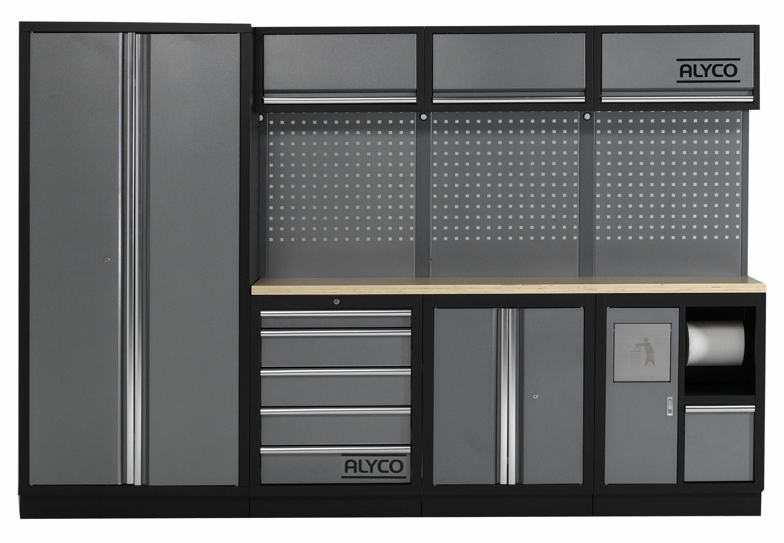 – 3 Armoires pour la partie supérieure d’un atelier pouvant être couplées à un panneau et à des piliers pré-percés, réalisées en structure métallique en tôle d’acier de 0,8 mm, et en structure métallique de 1 mm. Elles comportent un compartiment avec une porte qui s’ouvre vers le haut, avec des pistons à gaz pour une ouverture en douceur.