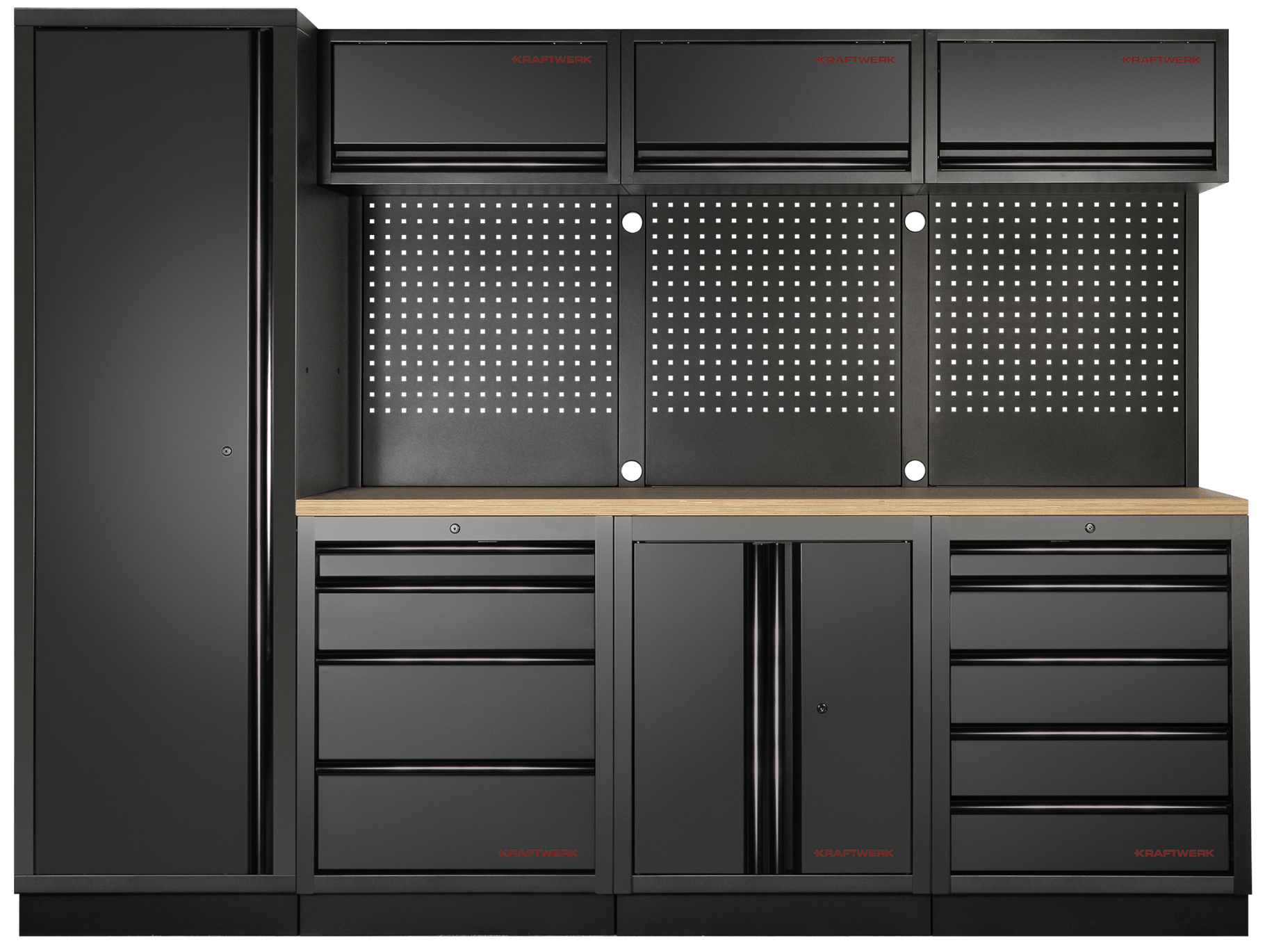 Mobilier d’atelier modulaire pour un assemblage personnalisable en fonction des besoins. Conception autoportante, ne nécessitant ni attaches ni murs de soutien, une installation facile et flexible. Chaque module peut être commandé individuellement. Tiroirs sur roulement à billes avec différentes hauteurs, adaptées à tous les inserts d’outils Kraftwerk (COMPLETO ABS, EVA, EVA3) avec verrouillage centralisé et individuel. Parois porte-outils perforées Euro standard. Plans de travail Multiplex de 35 mm en hêtre d’excellente qualité, usinés en Allemagne et protégés par un vernis d’huile de lin ou plan de travail inox 38 mm en option