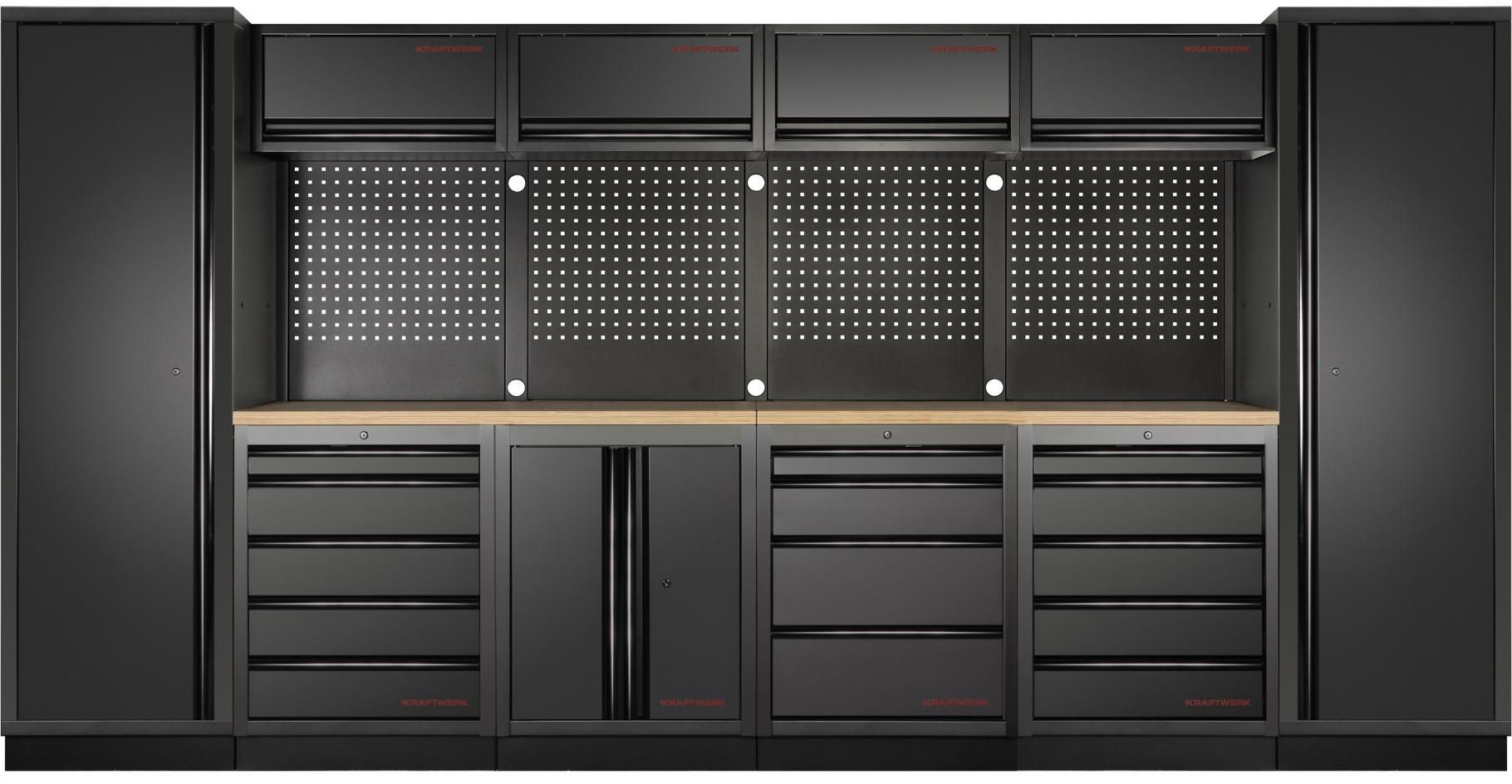 Le KRAFTWERK MOBILIO BLACK 6er combinaison comprend deux armoires hautes, chacune équipée de trois étagères. Celles-ci offrent amplement d’espace pour de grands outils, matériaux ou accessoires encombrants. De plus, les quatre armoires supérieures avec assistance à gaz permettent un accès facile et sécurisé aux fournitures fréquemment utilisées. Un autre élément est le meuble bas à deux portes, qui offre un espace de rangement flexible pour les outils ou appareils que vous souhaitez garder en sécurité et organisés.