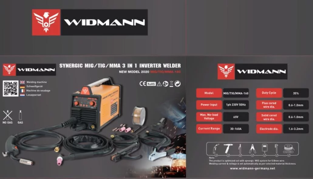 Le poste à souder combiné Widmann 160 ampères  MIG/TIG/MMA est un appareil pouvant effectuer différent procédés de soudage, à l’arc (baguette) en MIG avec fil fourré ou en TIG avec connexion de gaz (argon) (non fourni) . Vous serez convaincus de son efficacité.