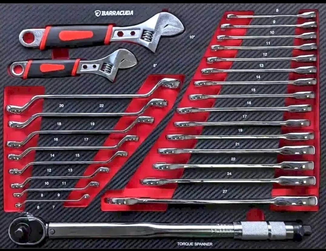 • 3e tiroir : lot de clés plates à cliquets de 8 à 27mm + clés bi-coudées a oeils de 6 a 22mm + clé dynamométrique 40/210nm 1/2 + 2 clés a molettes
