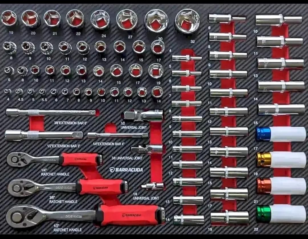 • 1 er tiroir : lot de 3 cliquet 1/4 3/8 1/2 avec douilles courtes et douilles longues rallonges et cardans + 4 douilles choc bague téflon