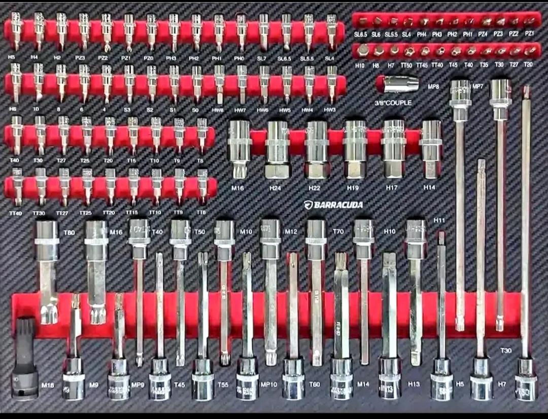 • 2e tiroir : assortiment d’embouts torx btr 6 pans 12 pans pour les 3 tailles de cliquets