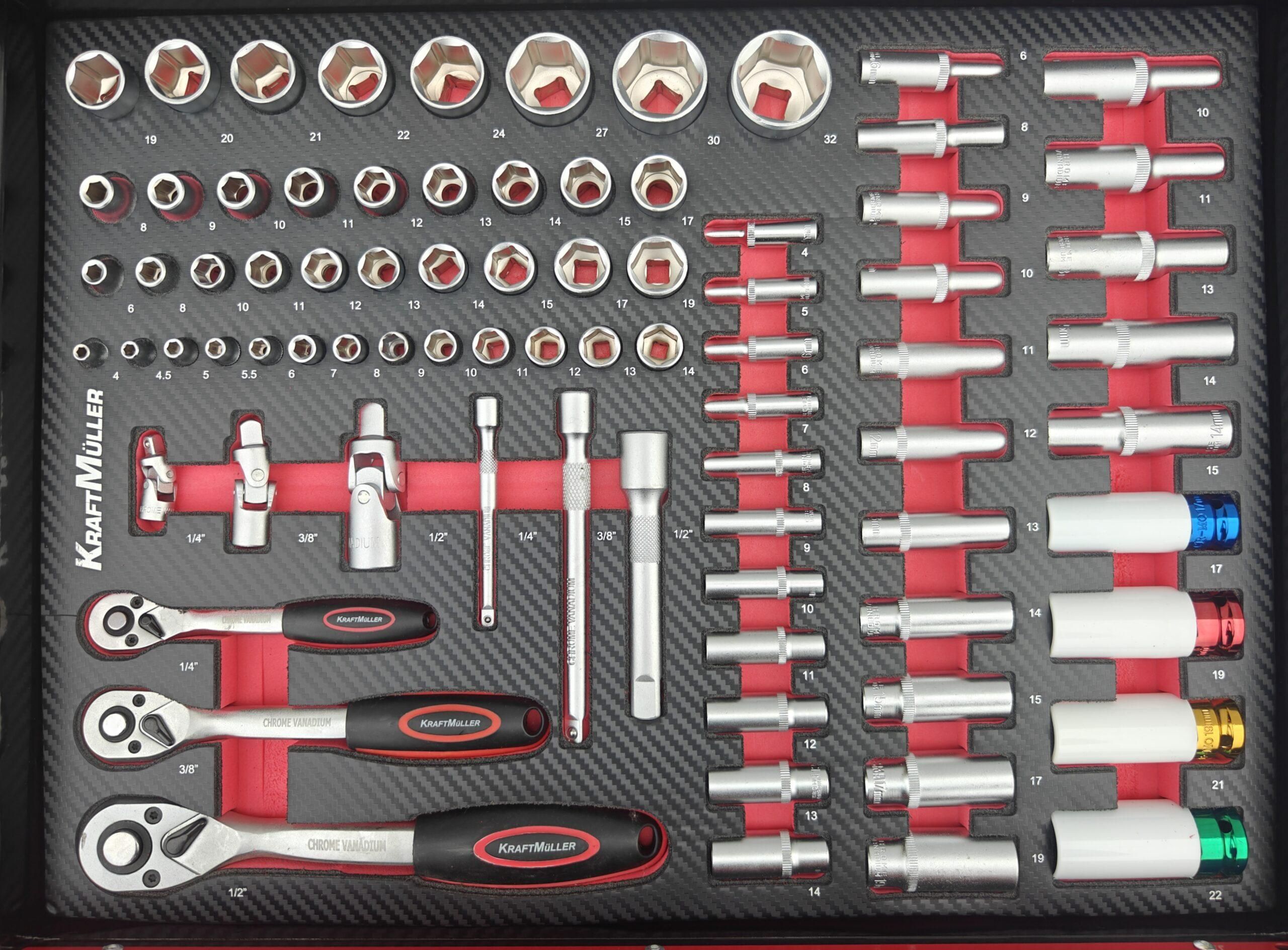 • 1 er tiroir : lot de 3 cliquet 1/4 3/8 1/2 avec douilles courtes et douilles longues + rallonges et cardans+ 4 douilles choc bague téflon