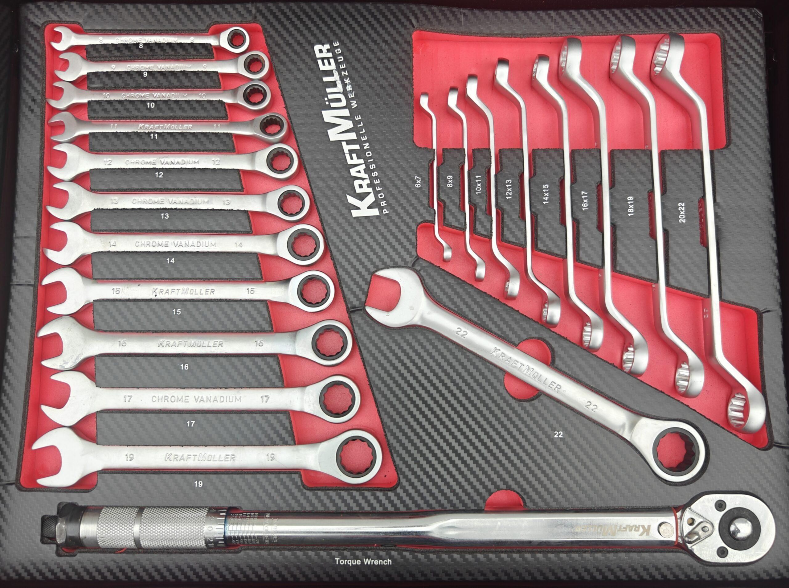 • 3eme tiroir : lot de clefs plates de 8 a 22mm à oeil cliquet + clé dynamometrique 1/2 40/210nm