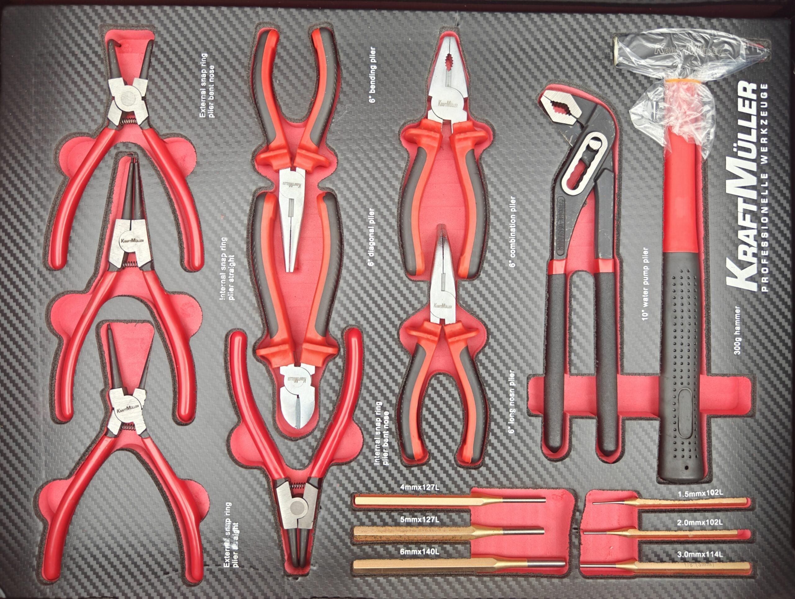 • 6eme tiroir : assortiment de pinces, marteau + chasses goupilles