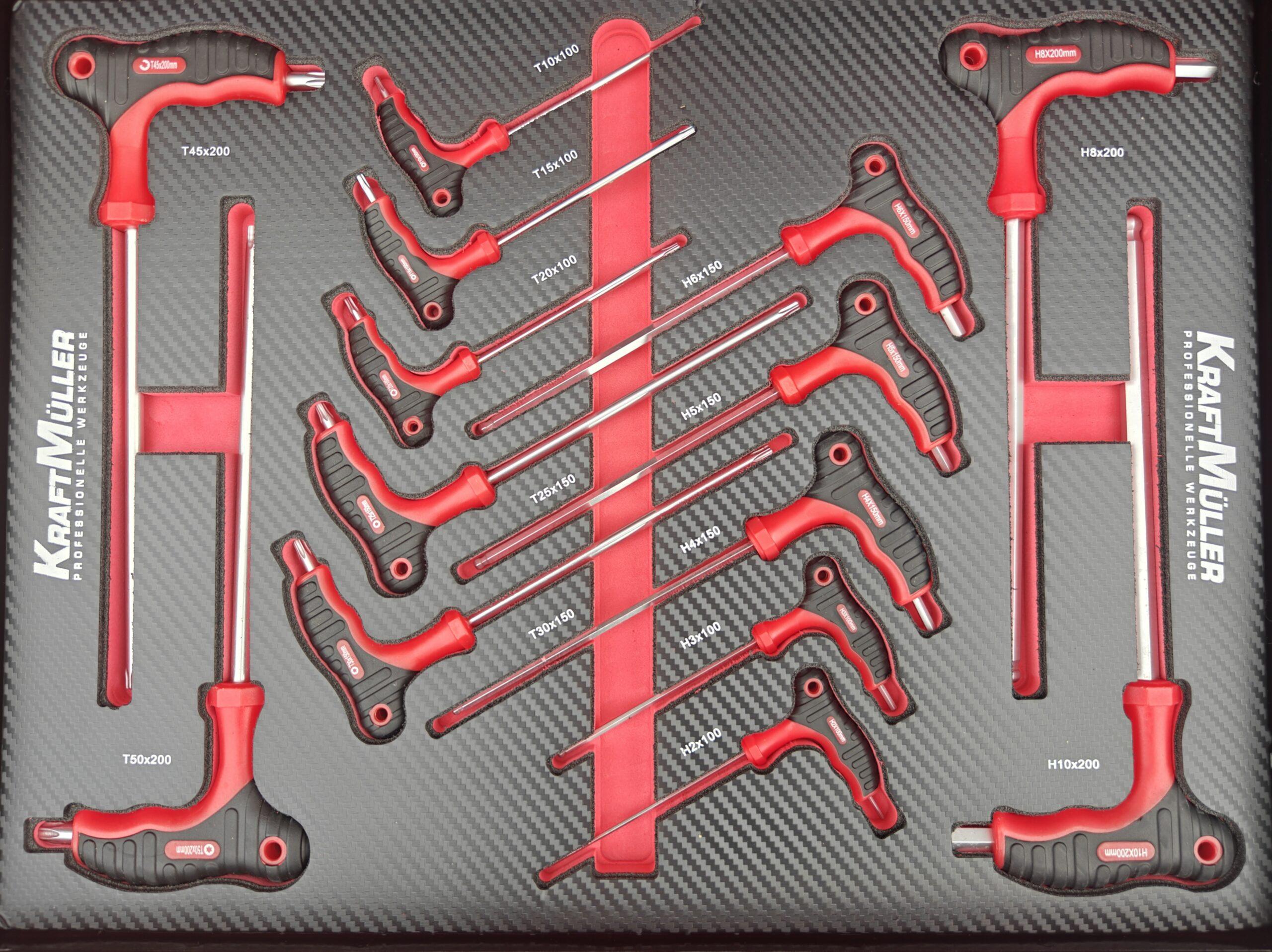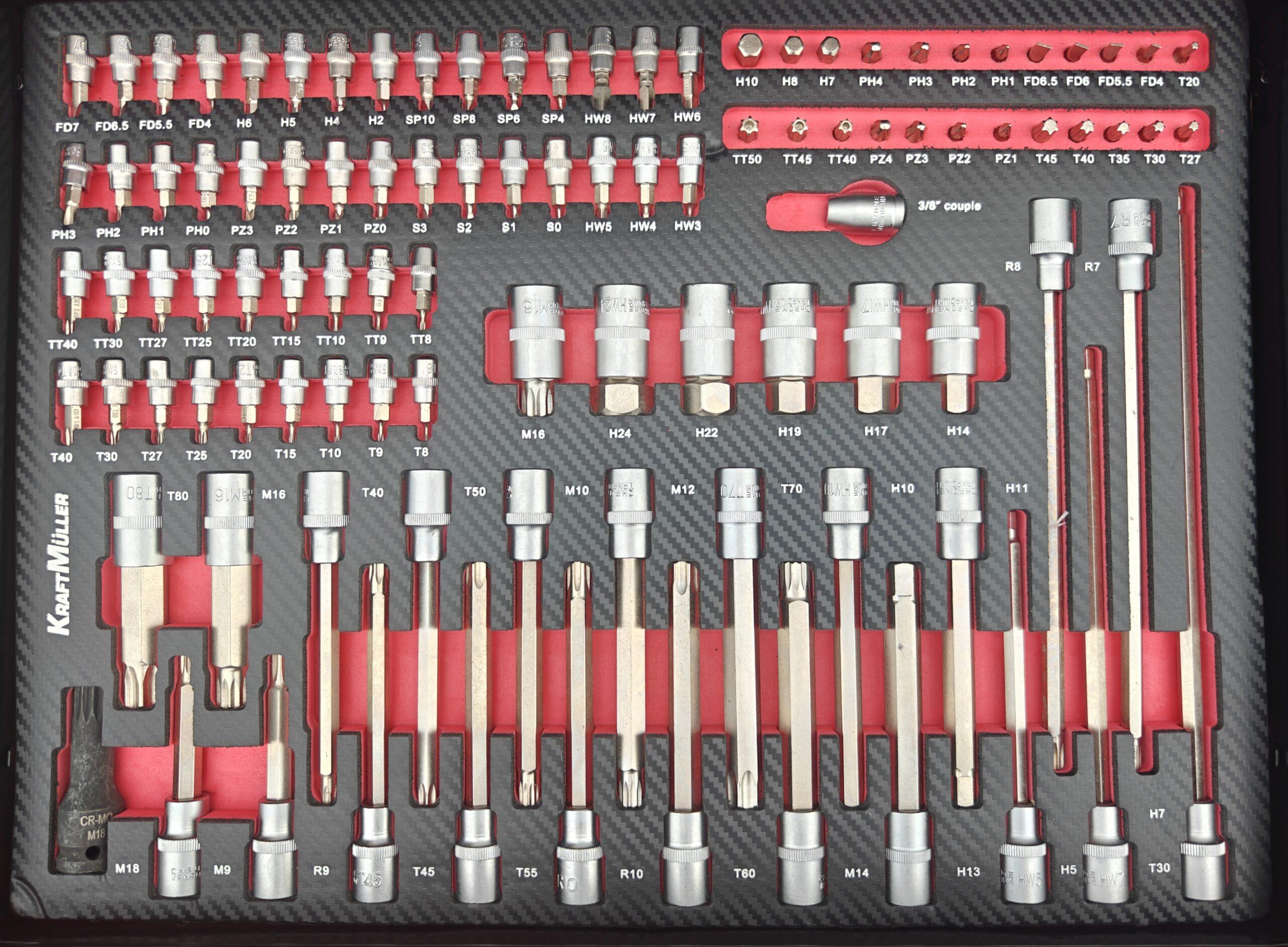 • 2eme tiroir : assortiment d’embouts torx btr 6 pans 12 pans pour les 3 tailles de cliquet
