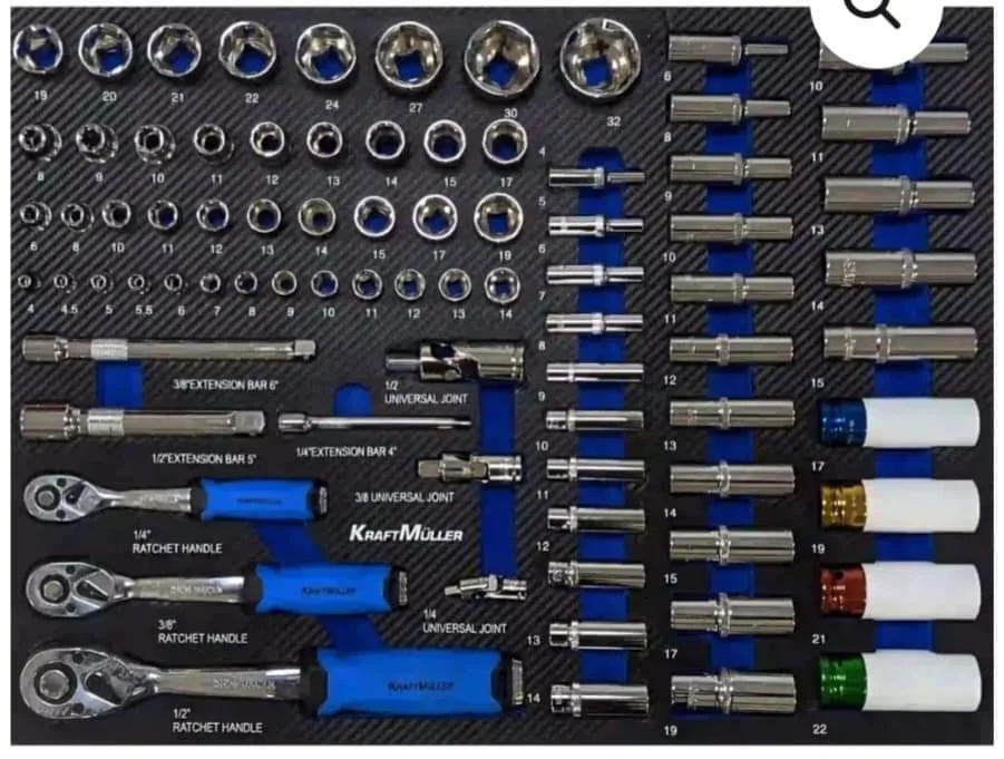 • 1 er tiroir : lot de 3 cliquet 1/4 3/8 1/2 avec douilles courtes et douilles longues rallonges et cardans + 4 douilles choc bague téflon