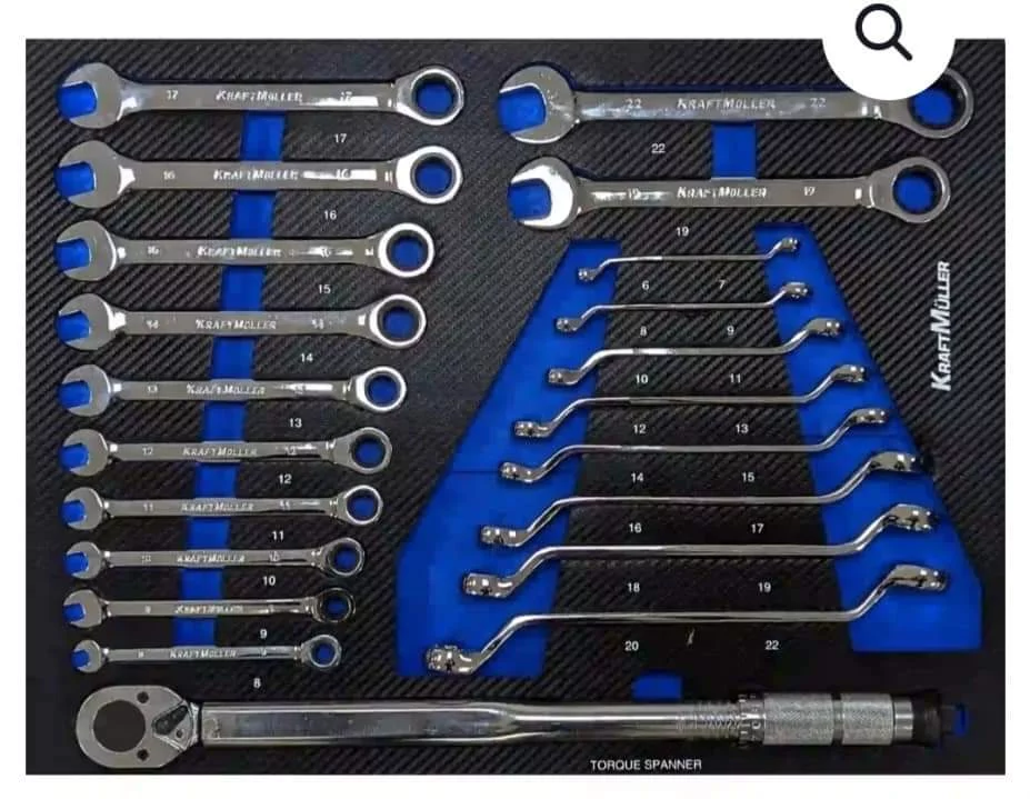 • 3e tiroir : lot de clés plates à cliquets de 8 à 27mm + clés bi-coudées a oeils de 6 a 22mm + clé dynamométrique 40/210nm 1/2 + 2 clés a molettes