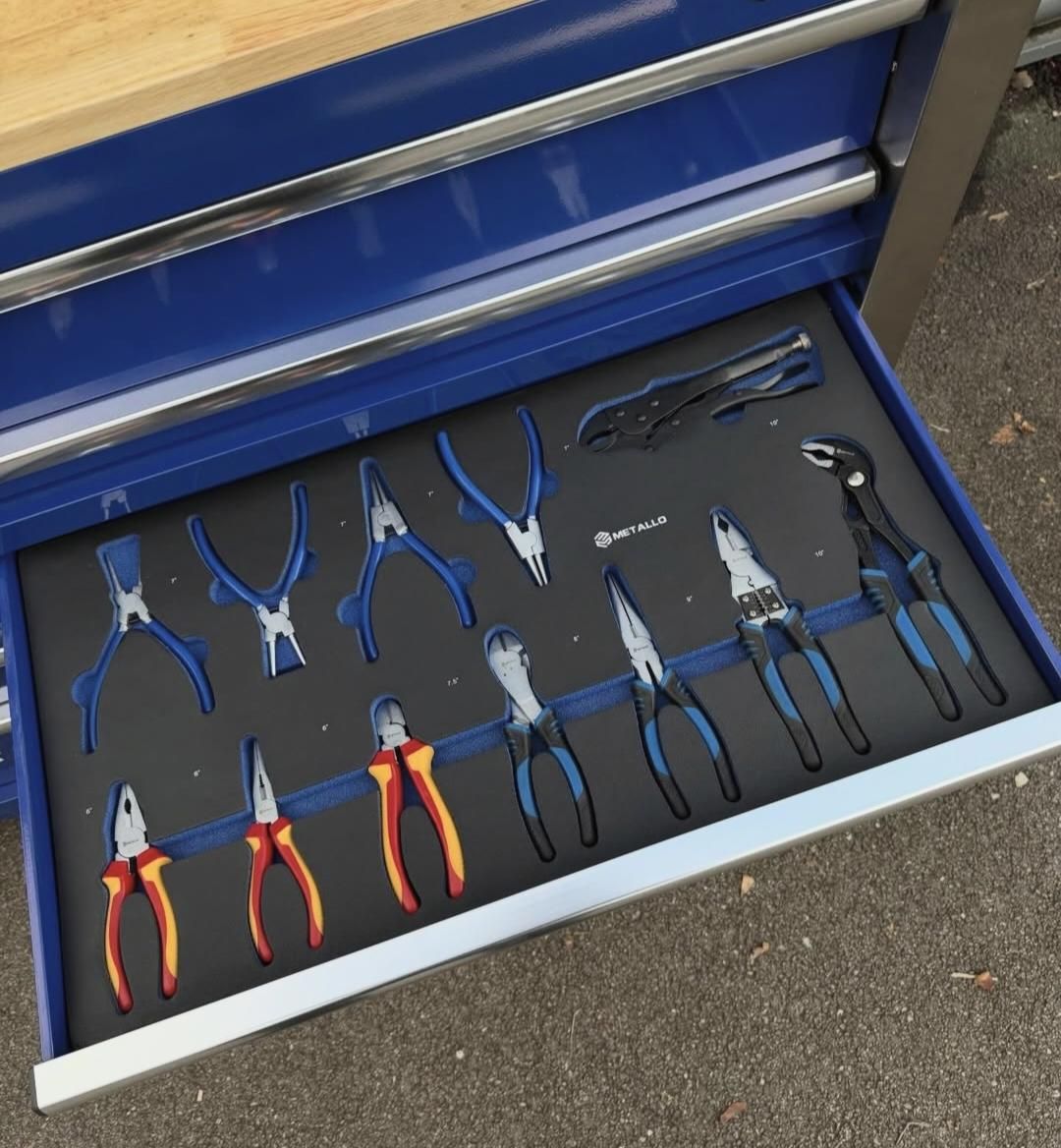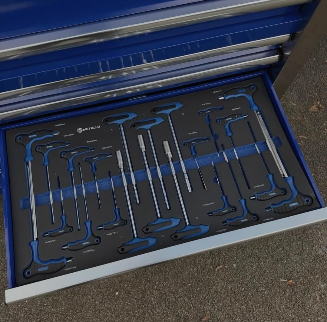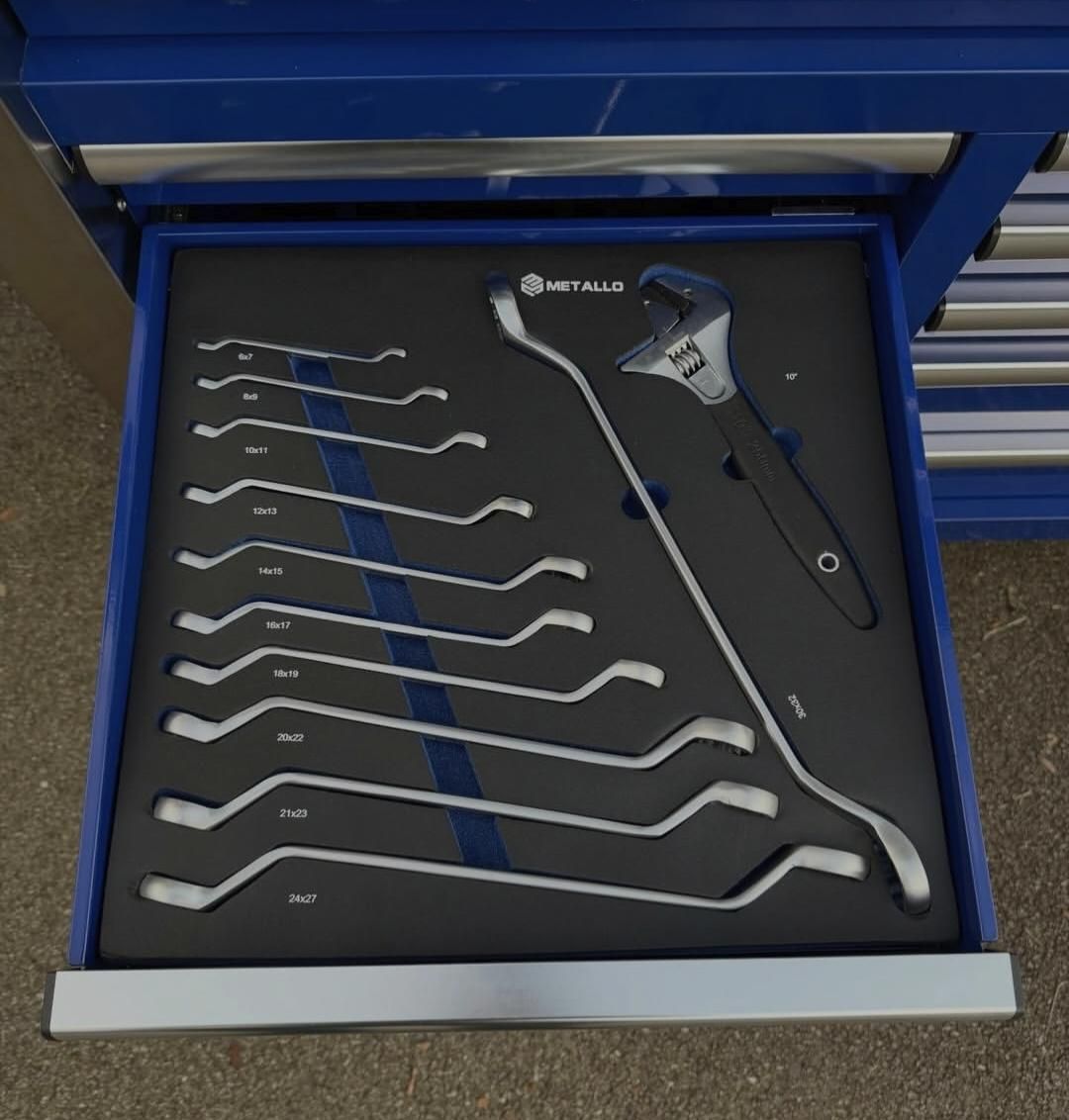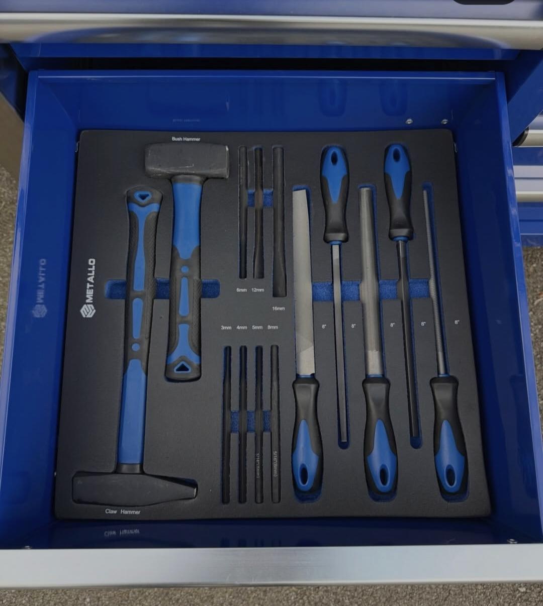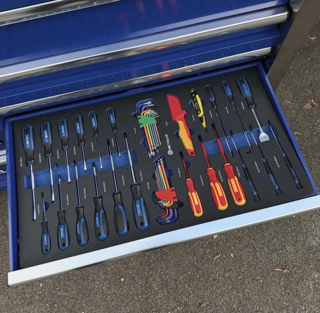 Cette servante est livrée entièrement équipée, avec un outillage soigneusement rangé dans des plateaux en mousse découpée haute densité, garantissant un rangement propre, sécurisé et un repérage immédiat des outils manquants.