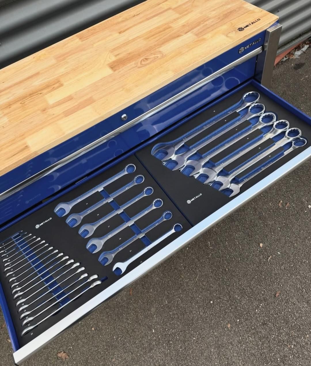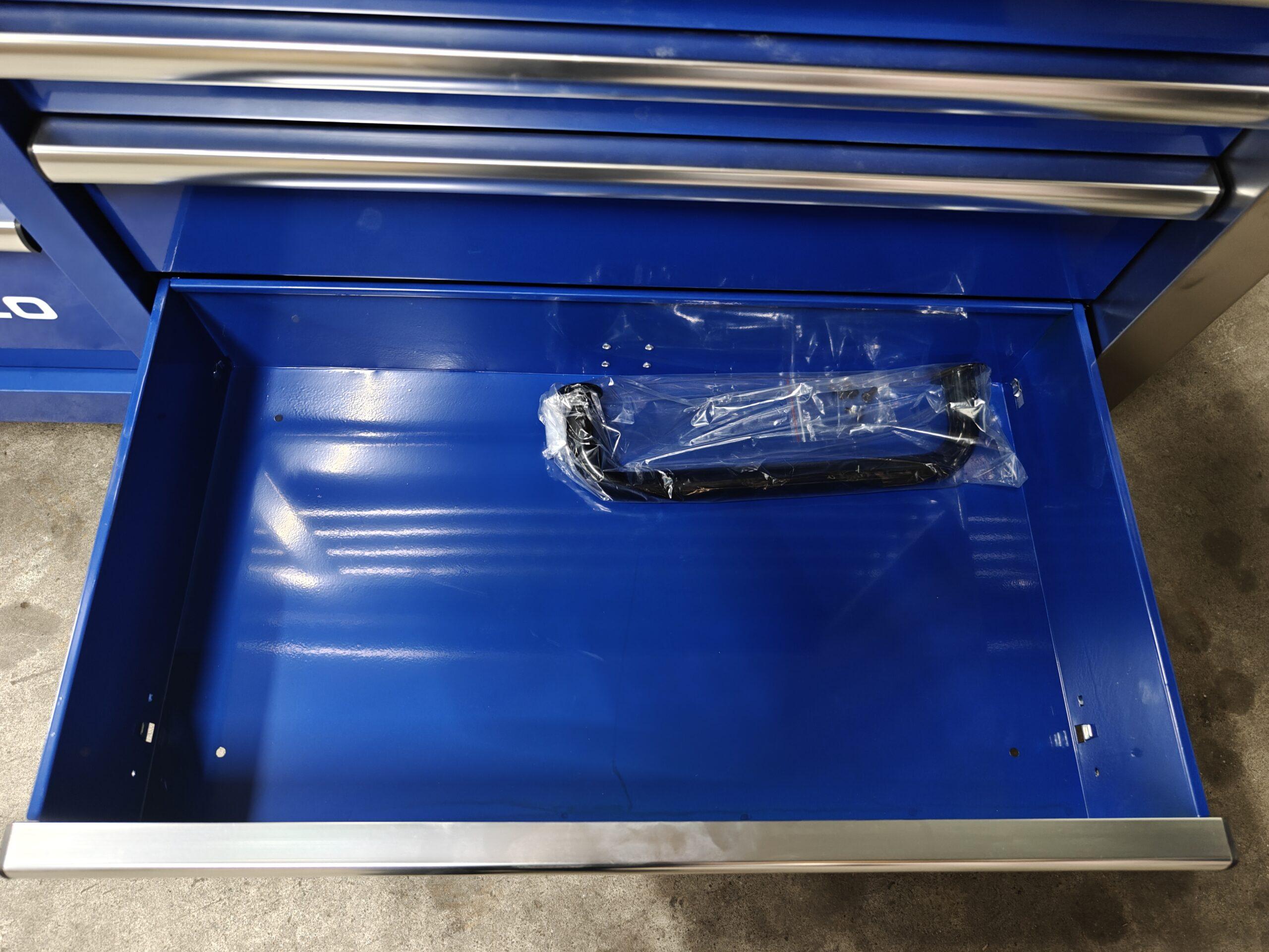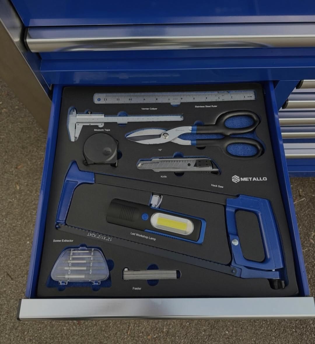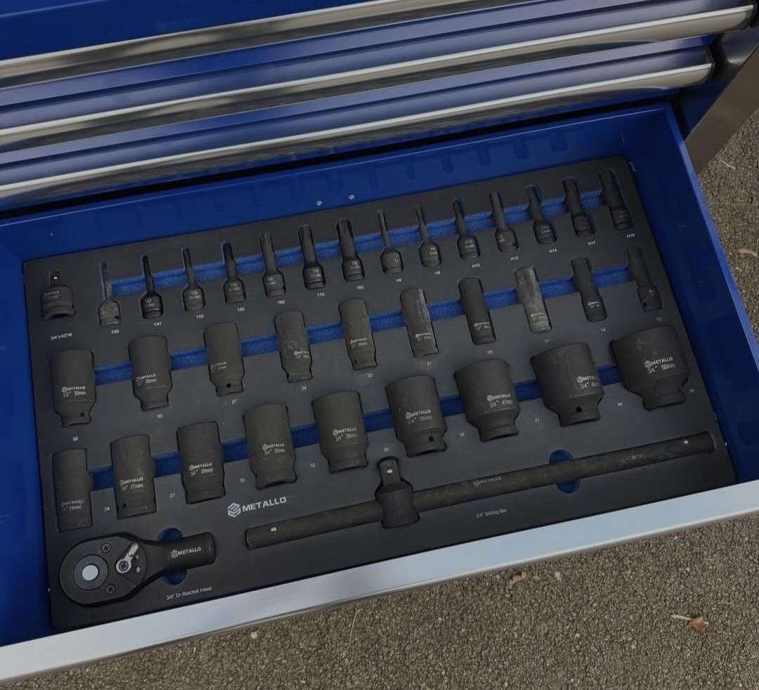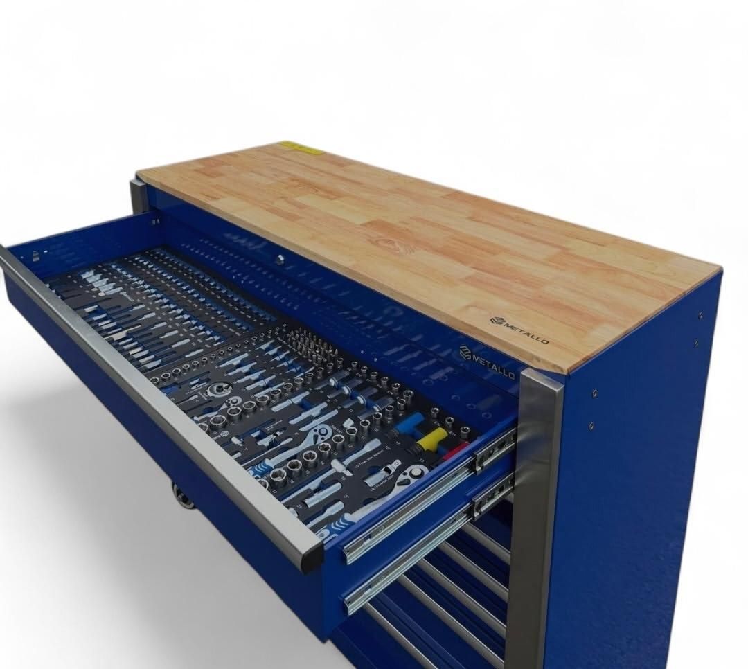 Cette servante est livrée entièrement équipée, avec un outillage soigneusement rangé dans des plateaux en mousse découpée haute densité, garantissant un rangement propre, sécurisé et un repérage immédiat des outils manquants.