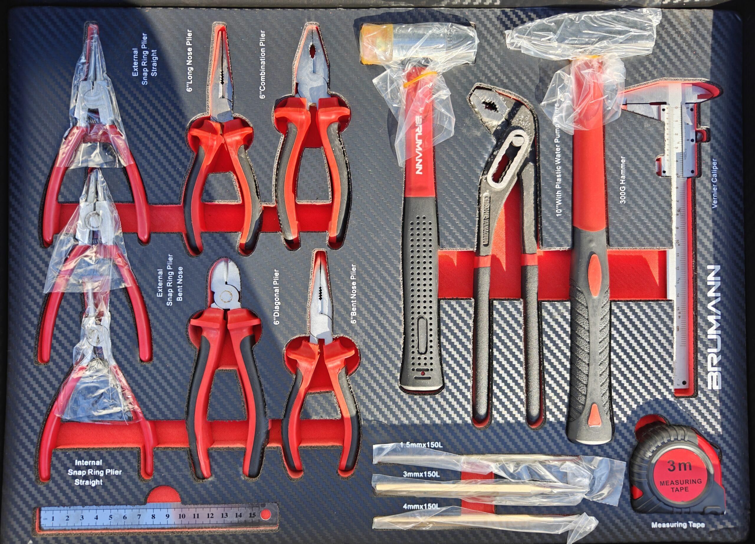 – 6e tiroir : assortiment de pinces, pince a circlips, marteau, maillet, pied a coulisse, reglet