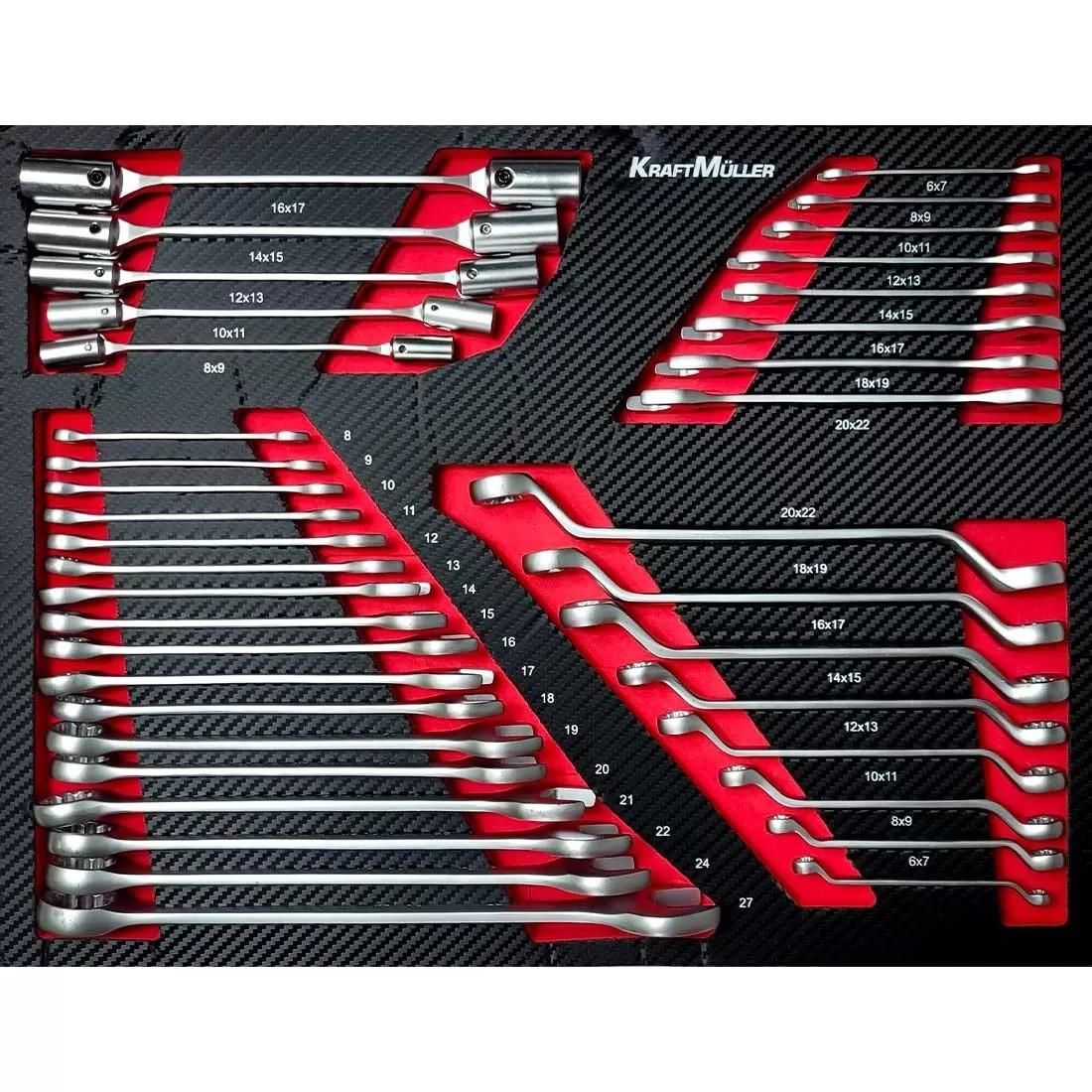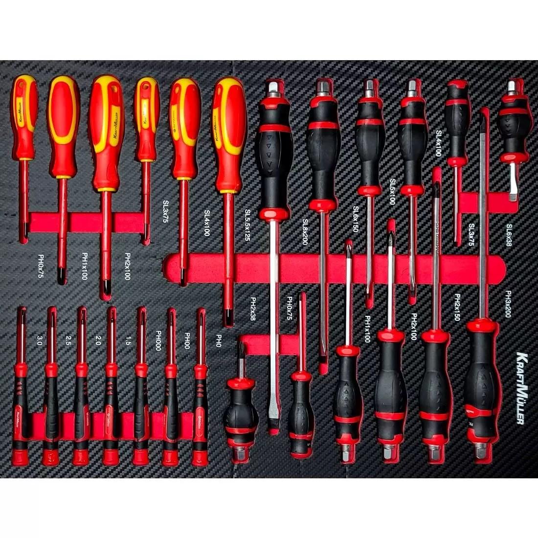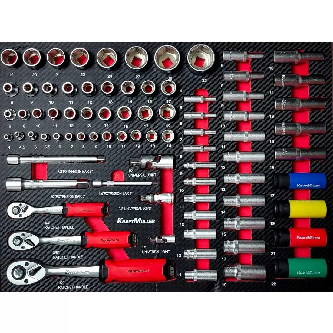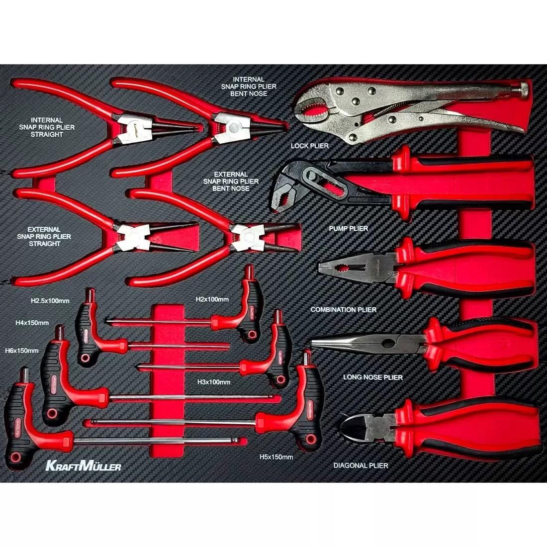 Les modules en mousse moulée et finition carbone sont faits pour un rangement optimal des outils et apportent un look raffiné à cette servante Kraftmuller.