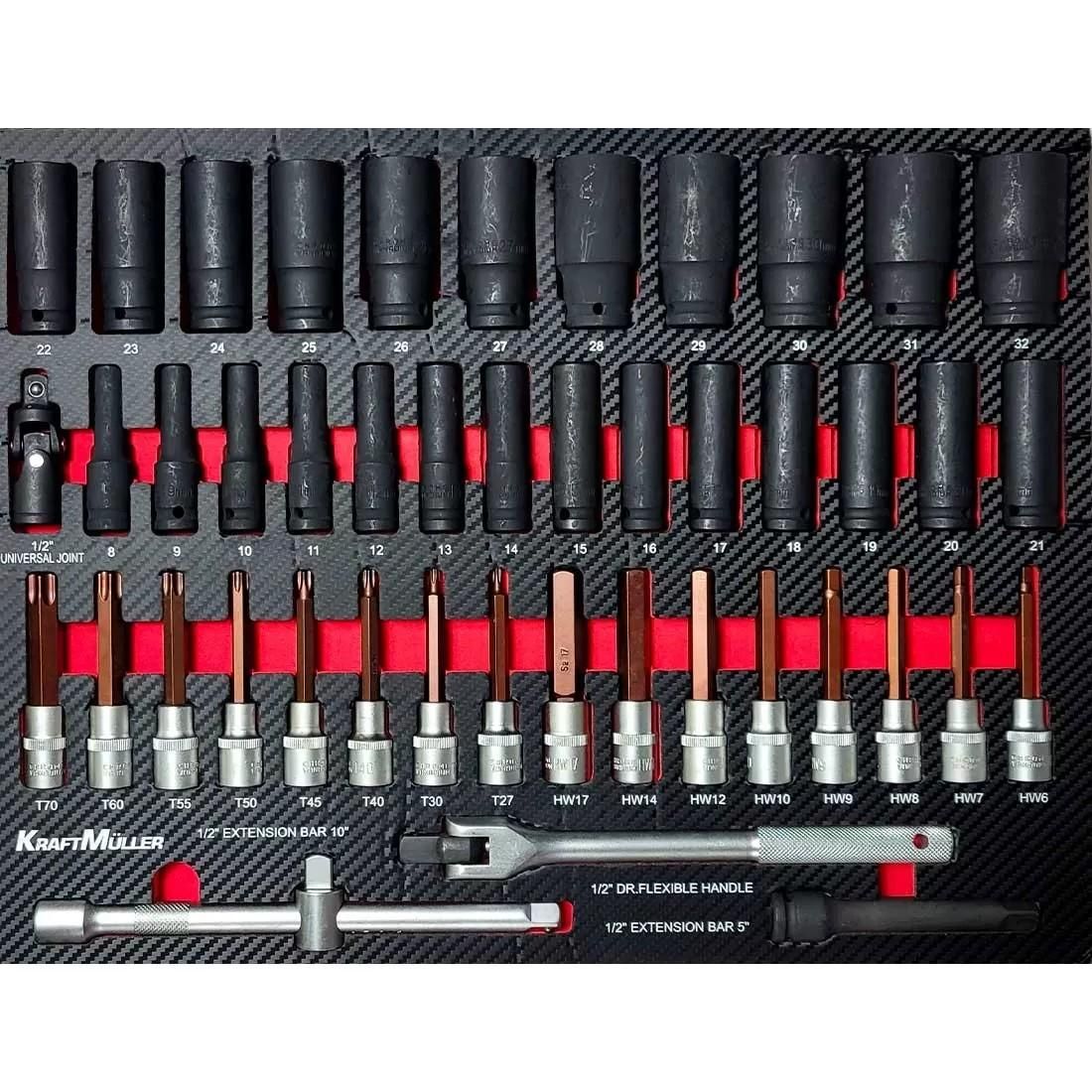 • 2e tiroir : assortiment d’embouts torx btr 6 pans 12 pans 1/2 + douilles chocs longues de 8 a 32mm 1/2