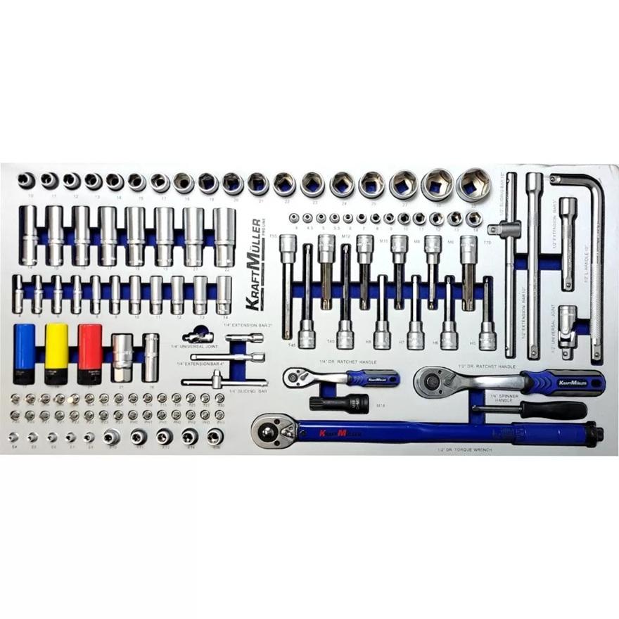 - 1 er tiroir : lot de 2 cliquets 1/4 et 1/2 avec douilles courtes et longues rallonges, barres et cardans+ 3 douilles choc bague téflon + douilles a bougies + clé dynamométrique 40/210nm + embouts btr et torx 1/2 mi long + embouts spéciaux 1/4 3/8 1/2 torx btr cruciforme plats xzn