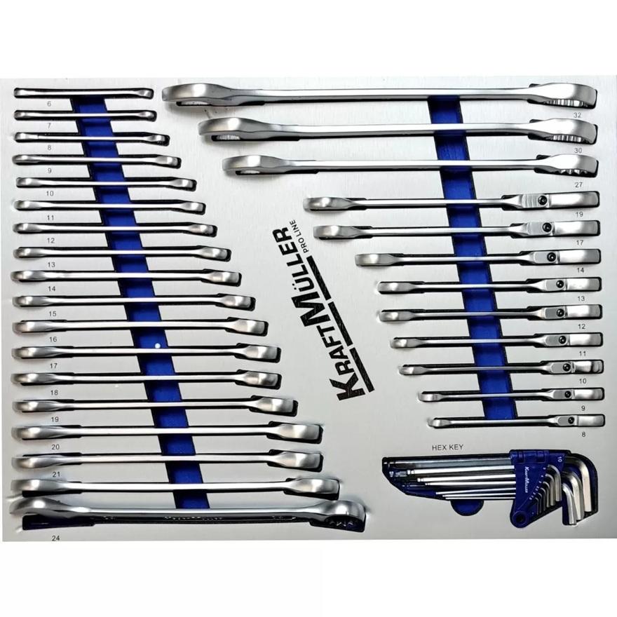 - 2eme tiroir : assortiment de clés plates à oeils de 6 à 32mm + clés a oeils a cliquet articulées de 8 a 19mm