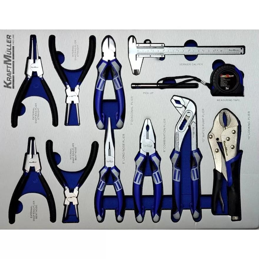- 7eme tiroir : assortiment de pinces a circlips + pinces classiques + pied a coulisse + metre + aimant